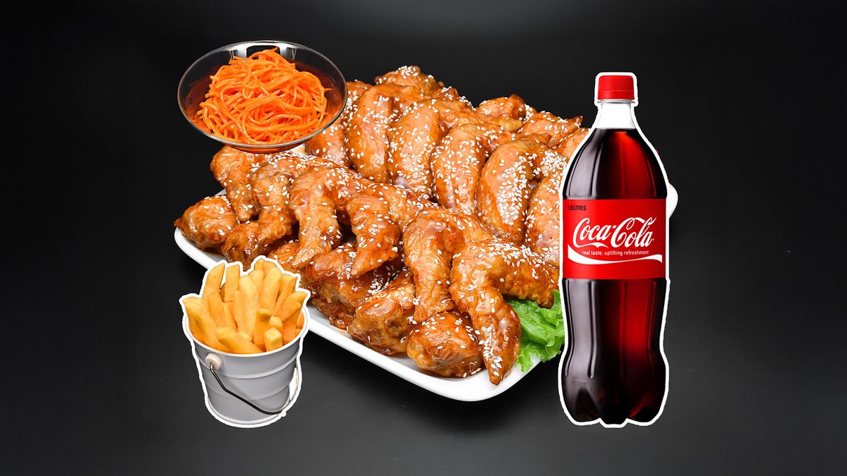 1 кг хрустящих крылышек без соуса, порция фри, салат морковь-ча, напиток Кола 1л.