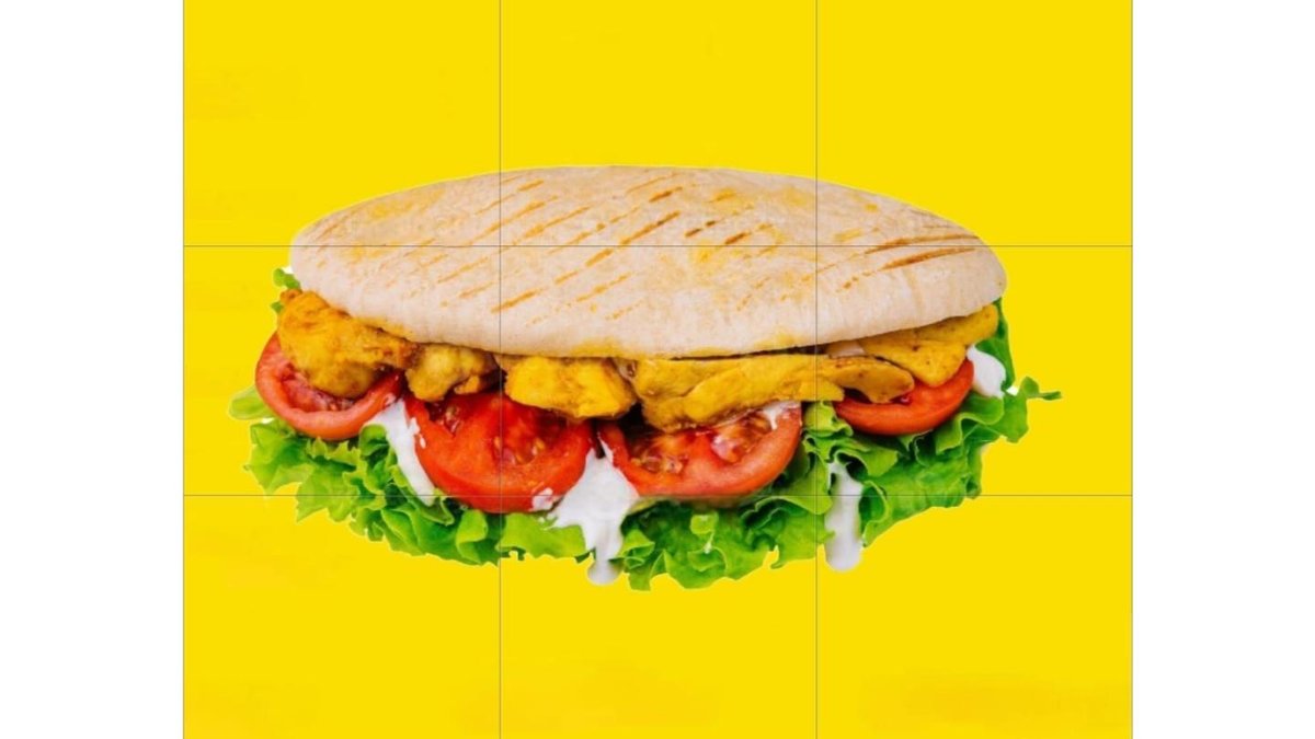 Лепешка, айсберг, маринованное халяльное куриное мясо, огурец, помидор, красный и белый соуса