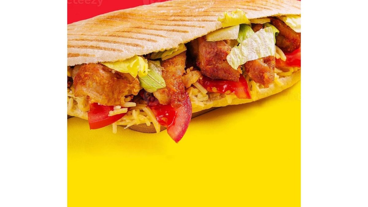 Багет, айсберг, помидор, свежие огурцы, маринованное халяльное ассорти из говяжего и куриного мяса, белый и красный соуса
