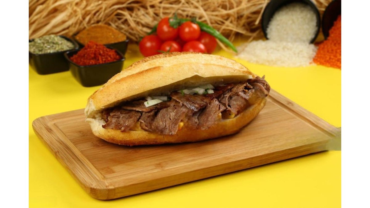 Казы Багет: аппетитный багет с казы из конины, свежим айсбергом, огурцами, помидорами и вкусным соусом.