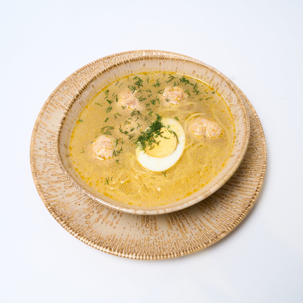 Домашний суп с тонкой лапшой и сочными куриными фрикадельками. Подаётся с ароматной пассеровкой, укропом и половинкой варёного яйца.
