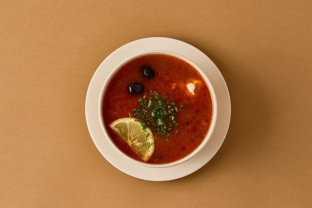 Солянка — наваристый суп с копчёным рулетом, колбасой, солёным огурцом, картофелем и овощами, подаётся с лимоном, сметаной, зеленью и маслинами.