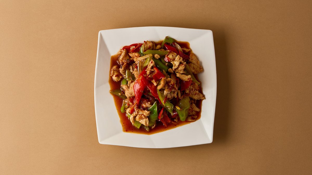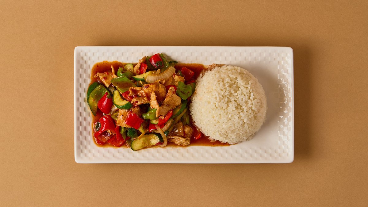 Курица по-тайски — сочное куриное филе с овощами, подаётся с гарниром на выбор.