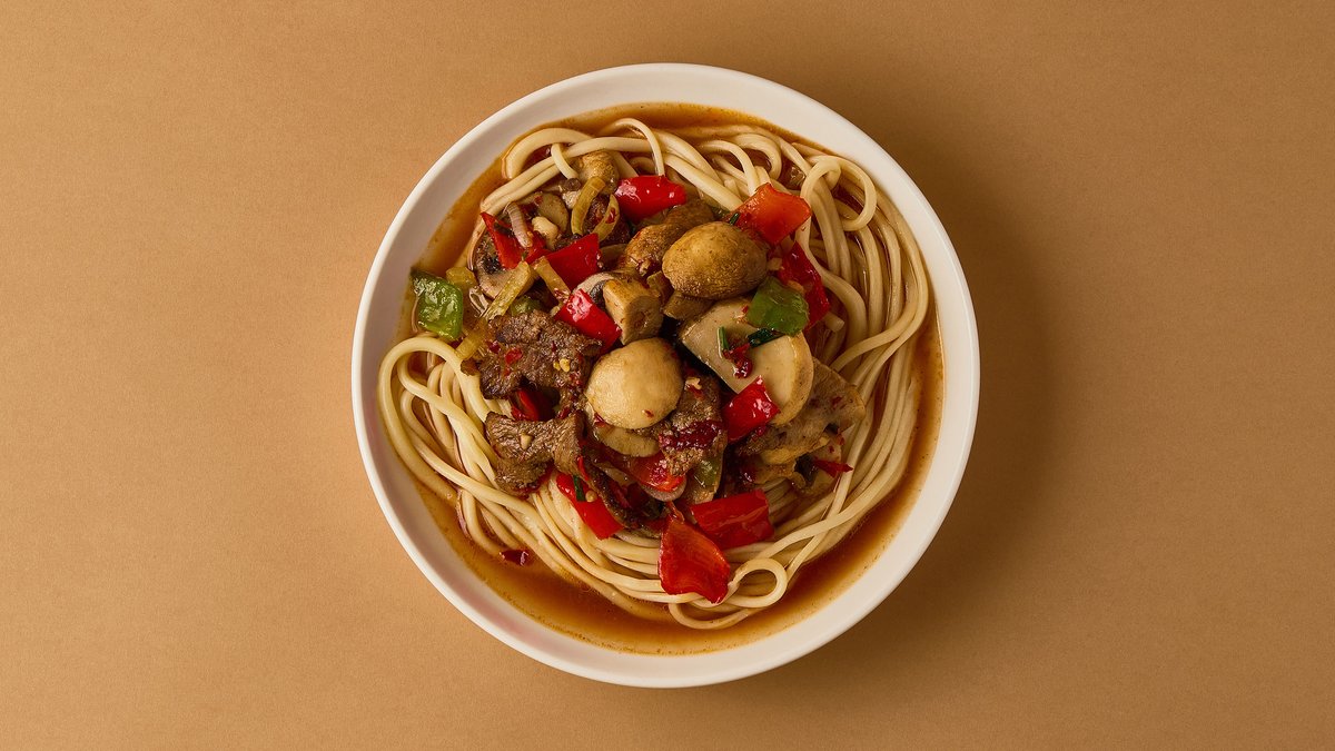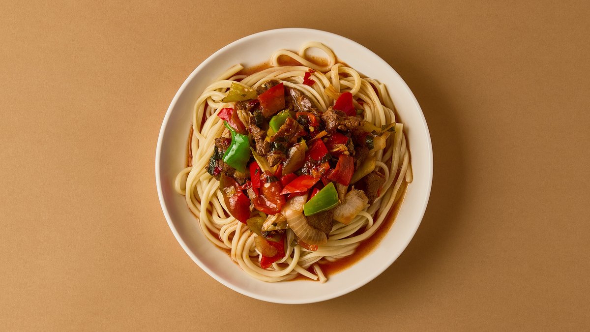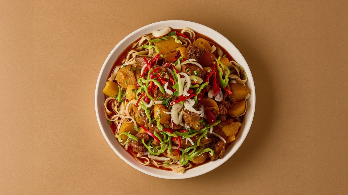 Домашний лагман — маринованное мясо с картофелем, редькой, байсаем и полугорьким перцем, приготовленное со специями и поданное с тянутой лапшой.