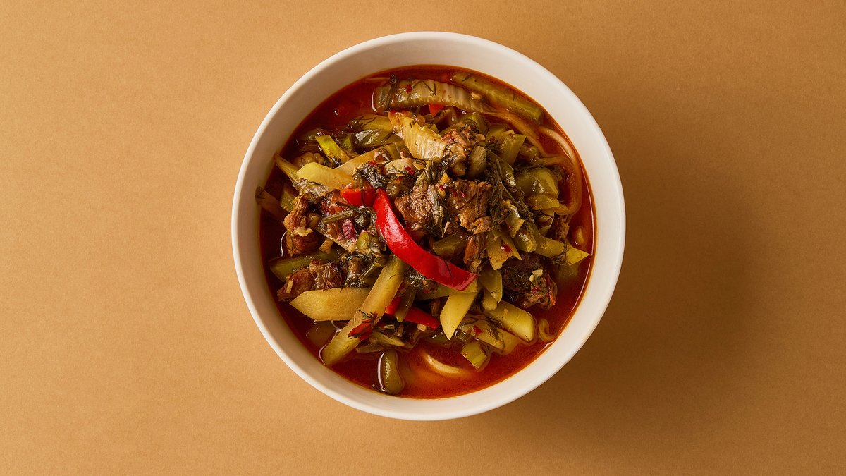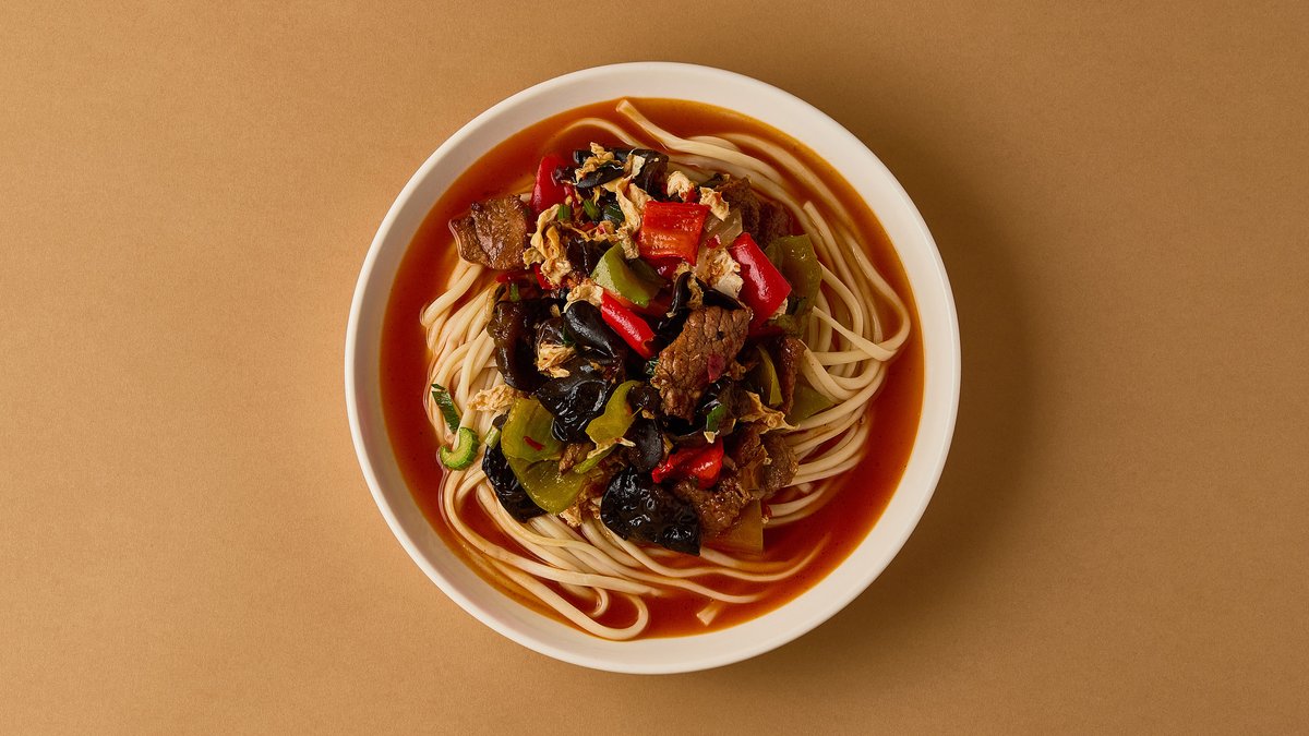 Кисло-острый суп: говядина, полугорький перец, фунчоза, древесные грибы, лук