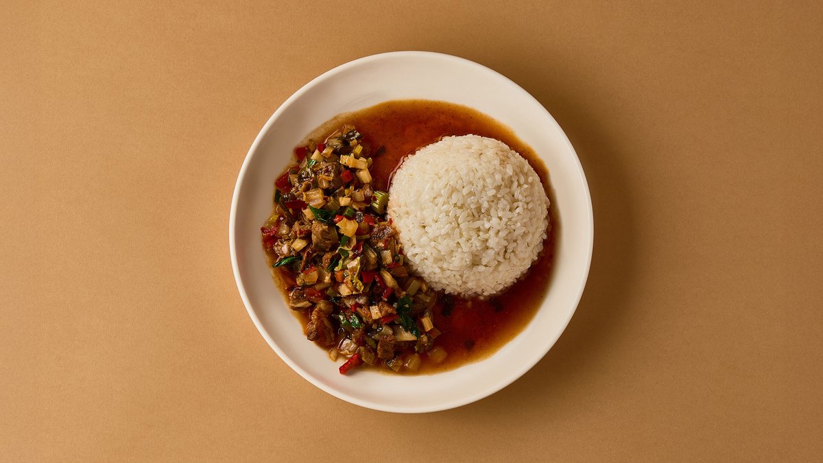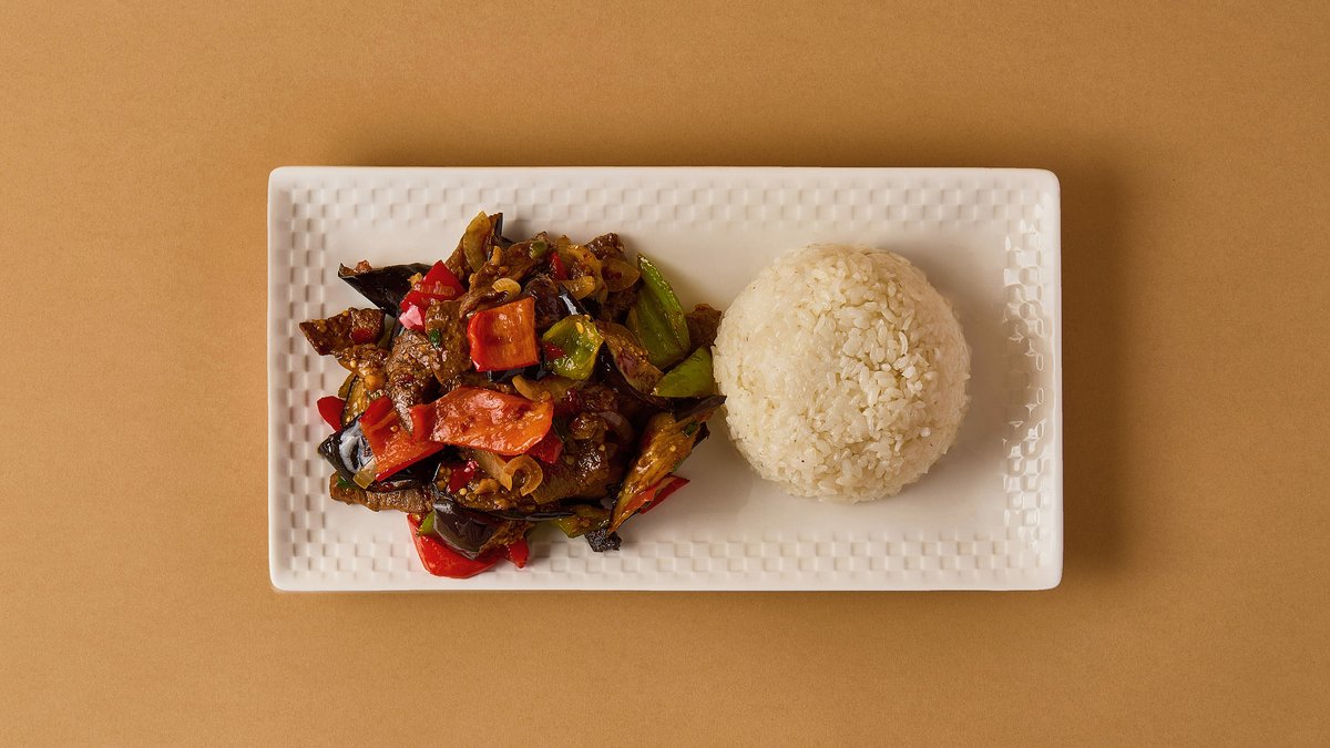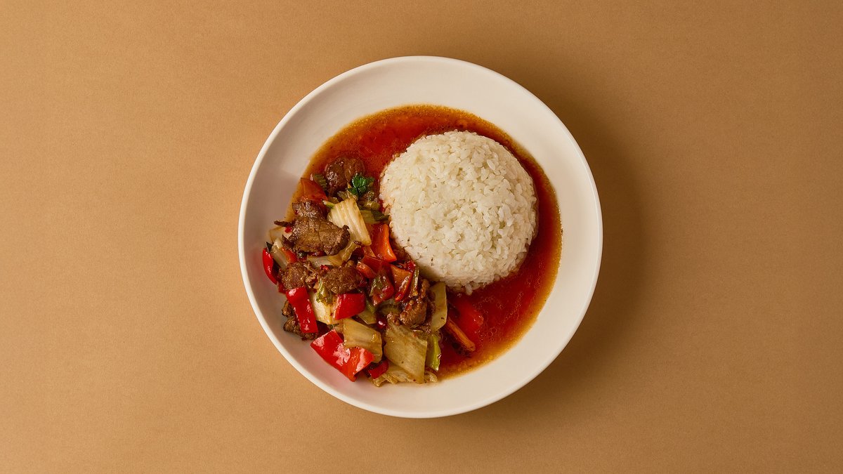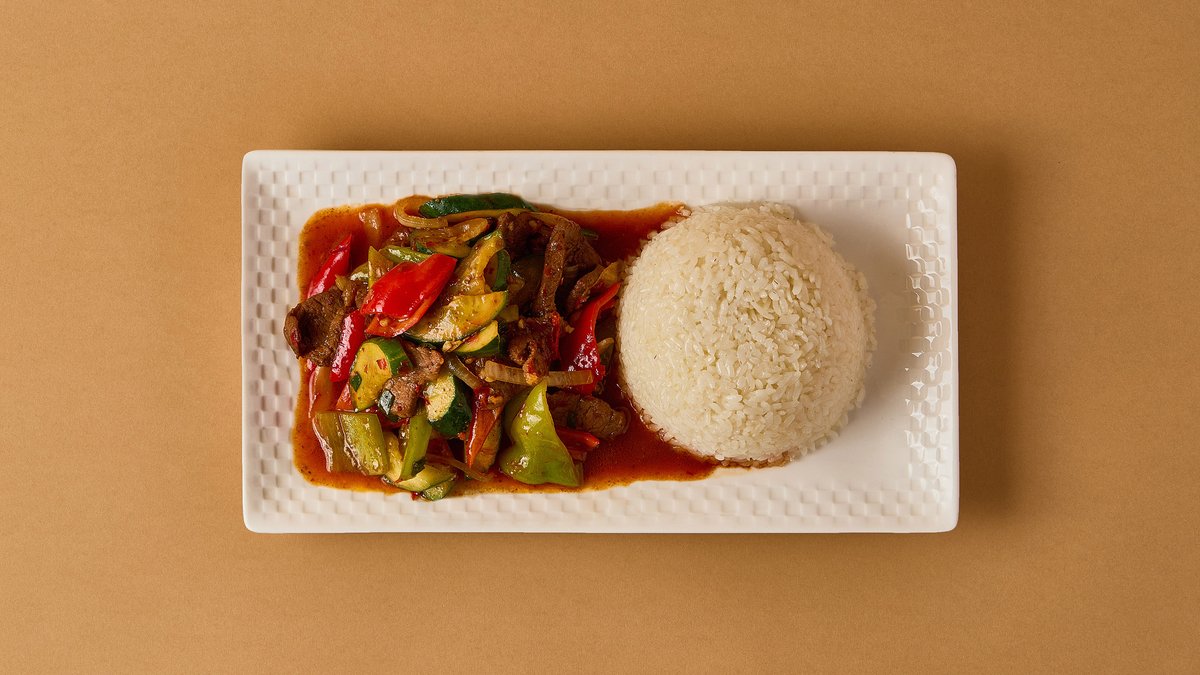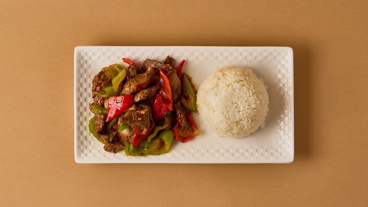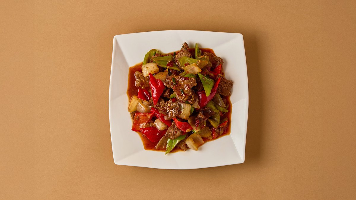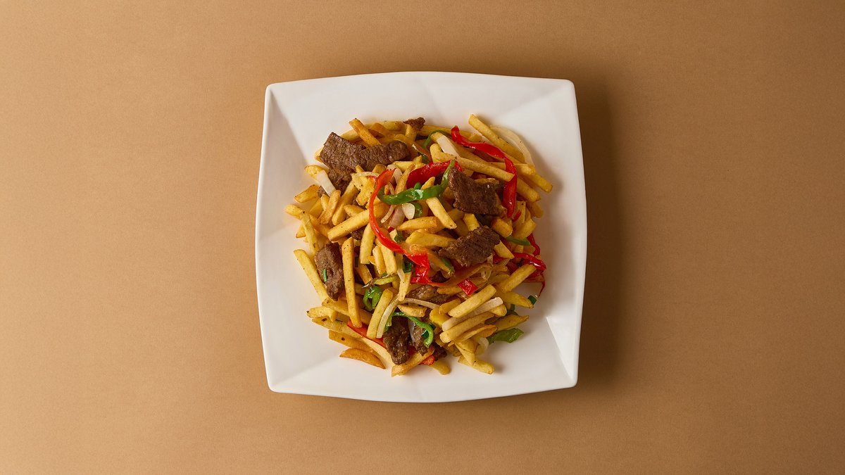 Фри с мясом — сочная говядина, обжаренная с полугорьким перцем и поданная с хрустящим картофелем фри и луком.