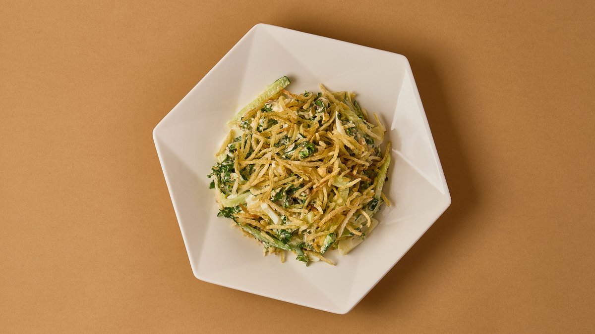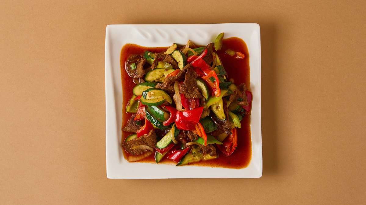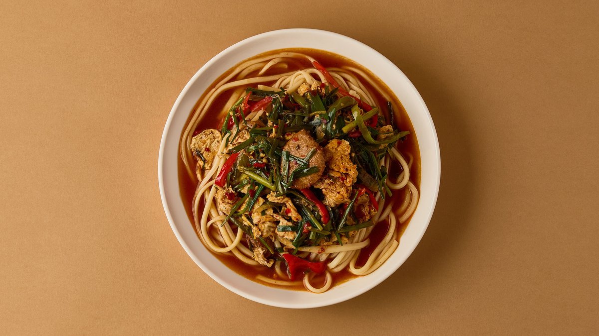 Гуйру Цомян — жареный лагман с крупно нарезанными овощами: байсаем, полугорьким перцем и сельдереем.