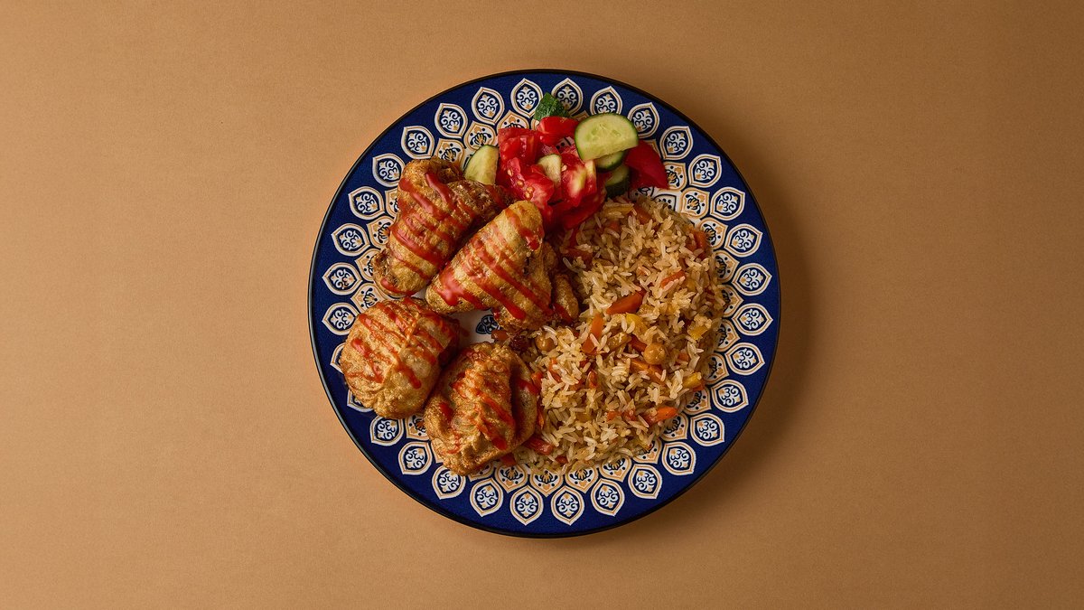 Микс от "Faiz"— фирменный сет: половина порции плова, куриные крылышки (2 шт.), хошан (2 шт.) и свежий салат.