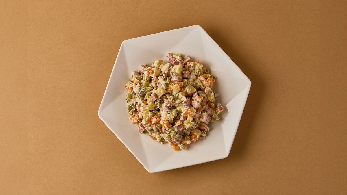 Оливье — любимый салат с картошкой, морковью, вареной колбасой, куриным яйцом, солёными огурцами, горохом и заправленный майонезом.
