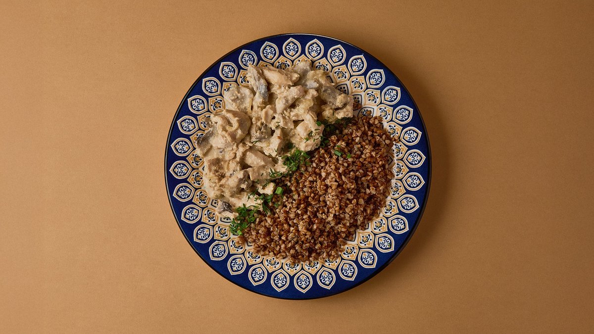 Курица с грибами — нежное куриное филе с грибами в сливочном соусе, подаётся с гарниром на выбор.
