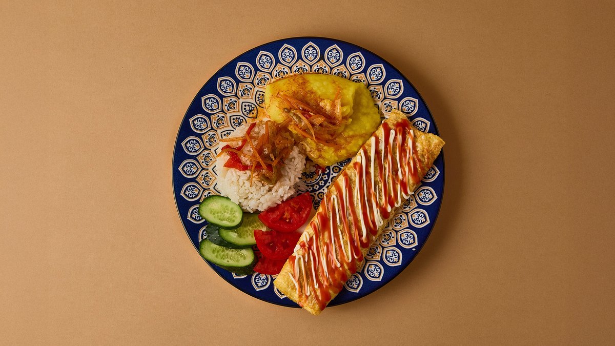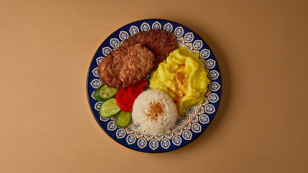 Азия Микс— сытное ассорти из колбасы, яйца, котлеты и куриной голени, подаётся с гарниром на выбор.