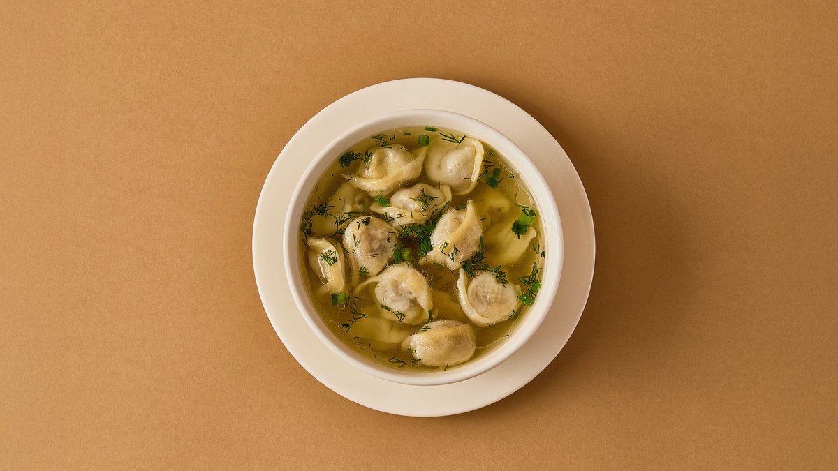 Пельмени домашние — нежные пельмени с говядиной и луком в ароматном бульоне, подаются со сметаной.