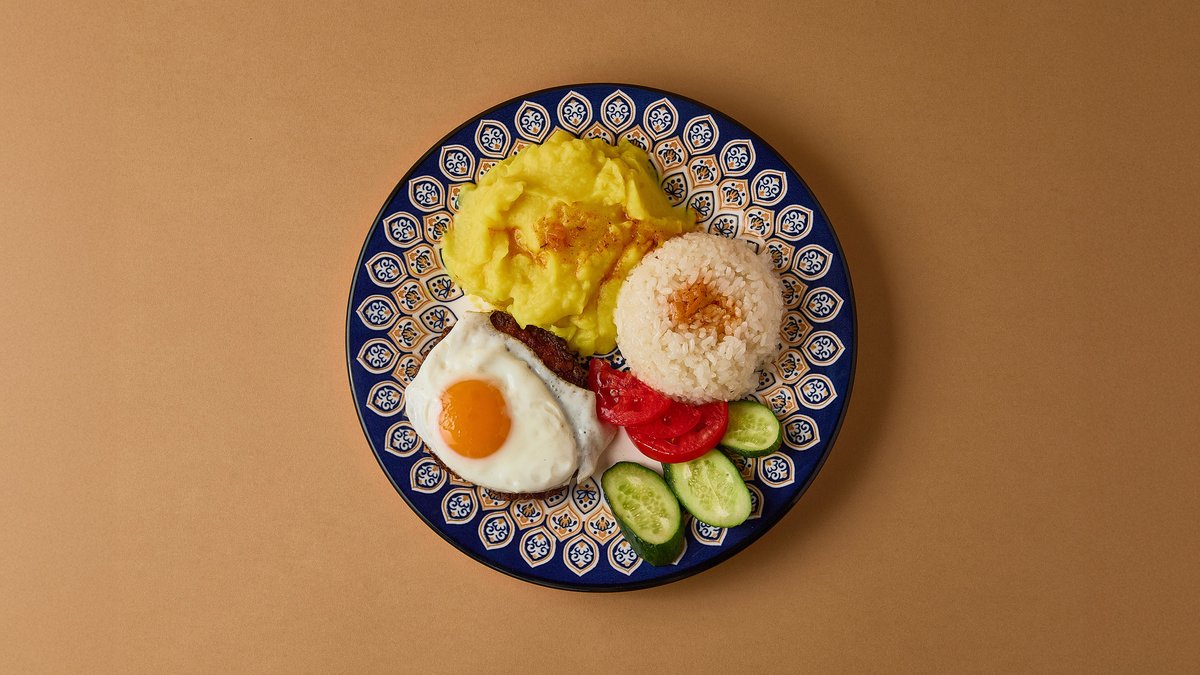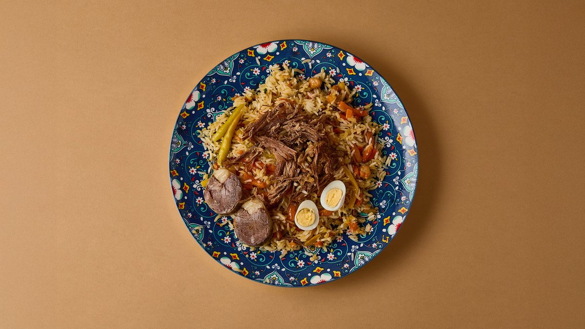 Плов «Ханский» — рассыпчатый рис «лазер» с казы и говядиной, перепелиным яйцом, жёлтой и красной морковью, изюмом и нутом, приправленный восточными специями.