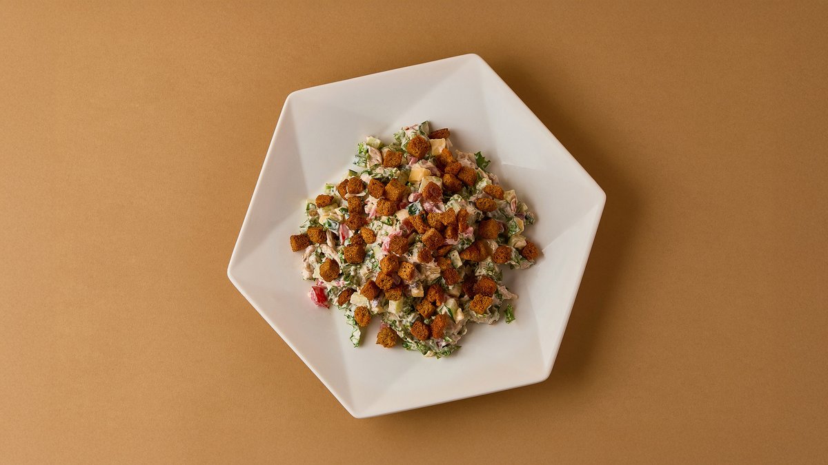 Салат с копчёным куриным рулетом, свежими огурцами и помидорами, твёрдым сыром, хрустящими сухариками и нежным соусом.