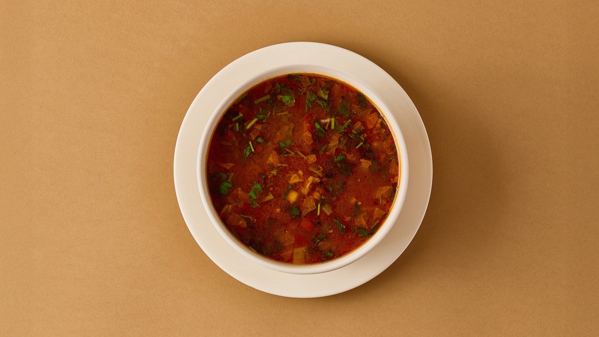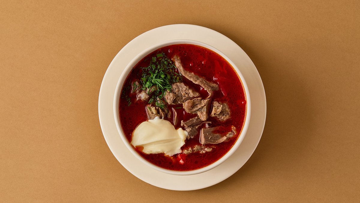 Борщ — наваристый суп с говядиной, капустой, картофелем, свёклой, морковью и луком, подаётся со сметаной.