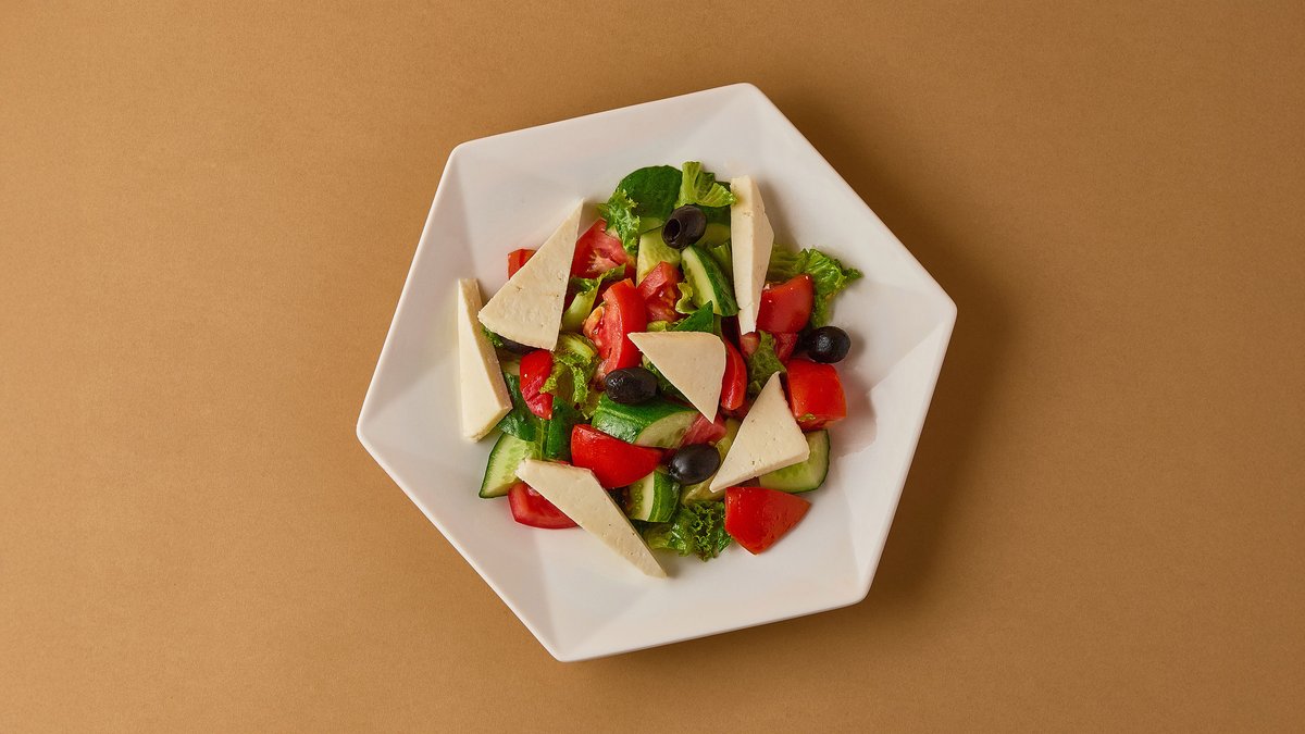 Свежие огурцы и помидоры с брынзой, маслинами, лимоном и салатным листом, заправленные ароматным оливковым маслом.