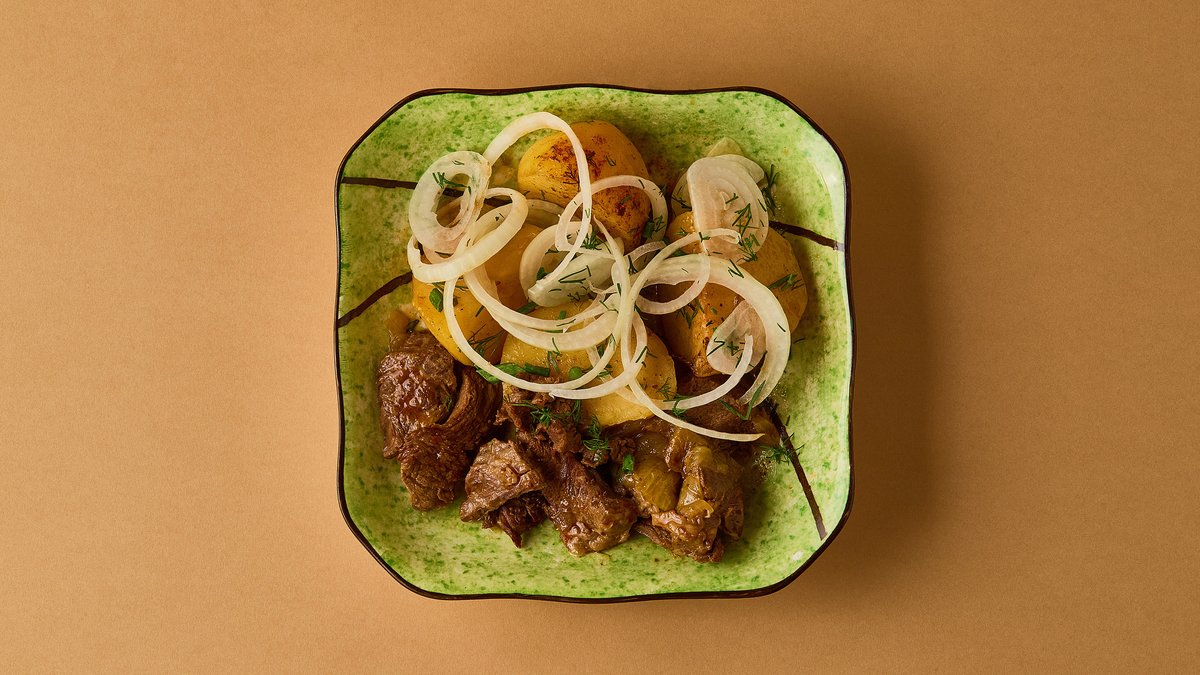 Куырдак — традиционное блюдо из кусочков говядины, картофеля и лука, тушённых со специями до насыщенного вкуса.