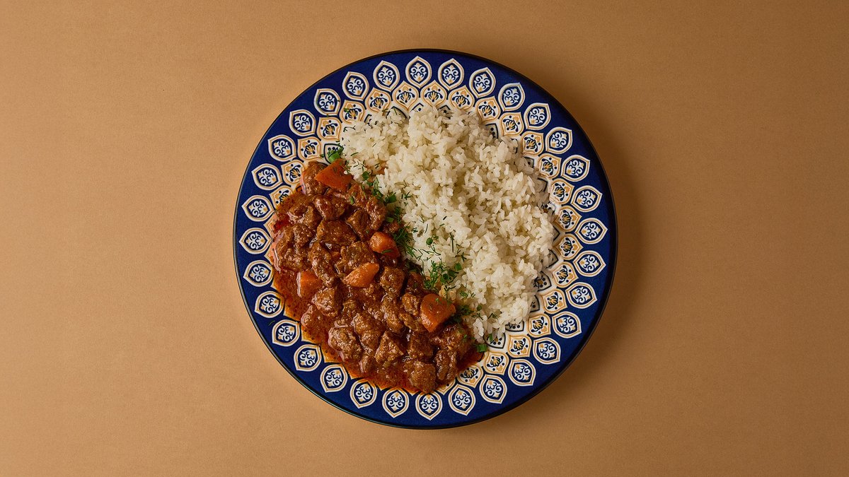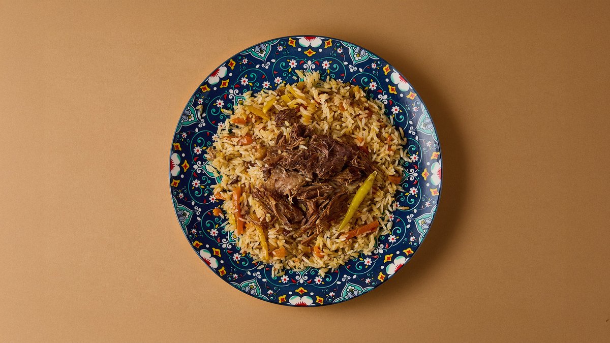 Плов «Праздничный» — ароматный рис «лазер» с говядиной, жёлтой и красной морковью, изюмом и нутом, приготовленный с восточными специями.