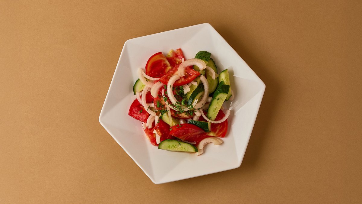 Свежие овощи — лёгкий микс огурцов, помидоров и зелени.
