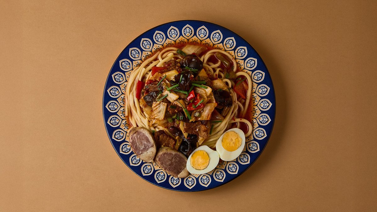 Фирменный лагман «FAIZ» — лагман с говядиной, казы, яйцом, чёрными грибами и полугорьким перцем в ароматном бульоне.