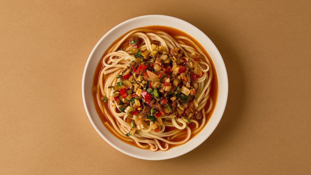 Суйру Цомян — жареный лагман с мелко нарезанными овощами: байсаем, полугорьким перцем и сельдереем.