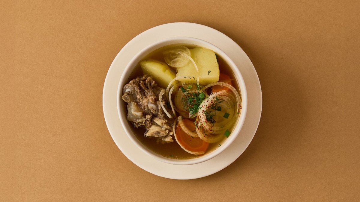 Наваристый суп на бараньем бульоне с мясом, картофелем и луком, подается с зеленью.