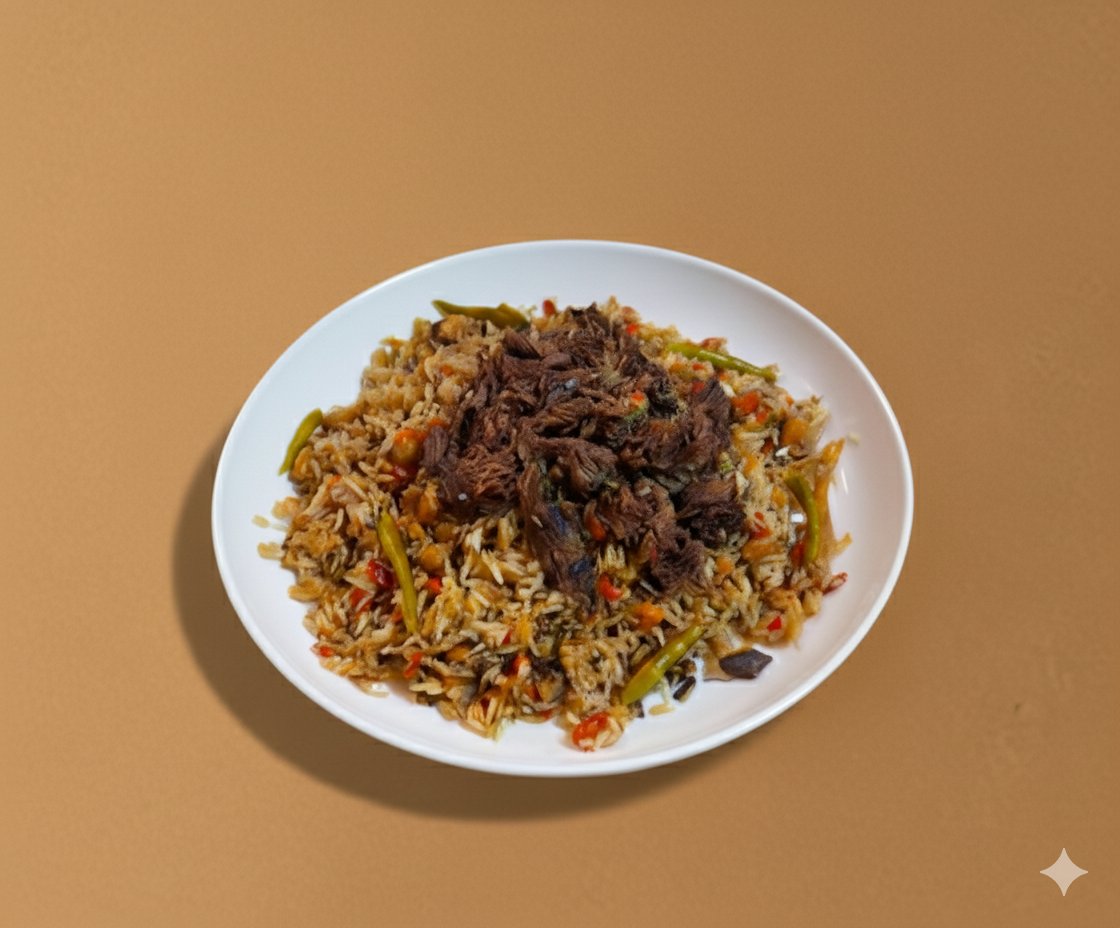 Сочный плов с говядиной, сладковатой морковью и изюмом, пропитанный пряным ароматом. Рассчитанный на 2-4 персоны.