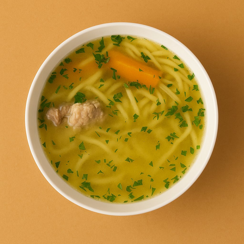 Лапша по-домашнему — ароматный бульон с курицей, домашней лапшой, морковью, луком и свежей зеленью.