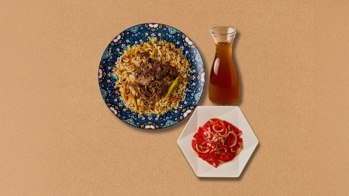 Пятничный дастархан, собранный с теплом и вкусом: ароматный плов праздничный, свежий ачичук и домашний компот 0.5 л.