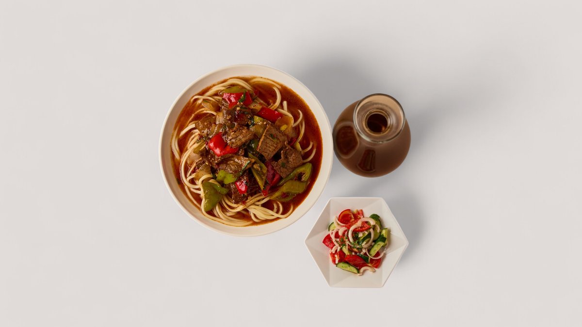 Насыщенный лагман с говядиной, свежие овощи и прохладный яблочный компот собственного производства (500 мл)