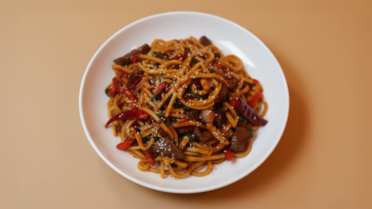 Хао-Хуа лагман — лагман с маринованным мясом, байсаем и полугорьким перцем, приготовленный со специями и покрытый жареным яйцом.