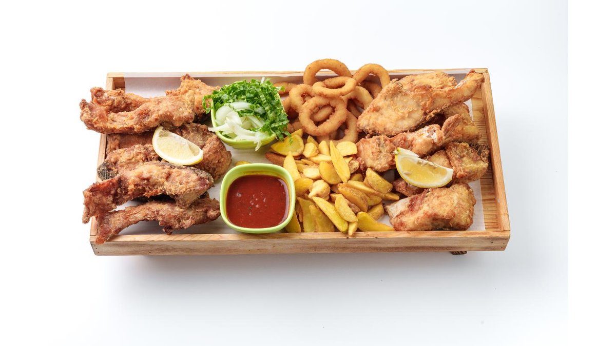 сазан - 1 кг, судак - 1 кг, берш - 1 кг, сом или белый амур (по сезону) - 1 кг, форель на гриле - 1 кг, креветки - 500 гр, семга - 700 гр, луковые кольца, рыбные палочки, мидии в сливочном соусе, рис, овощи на гриле, соус, лук