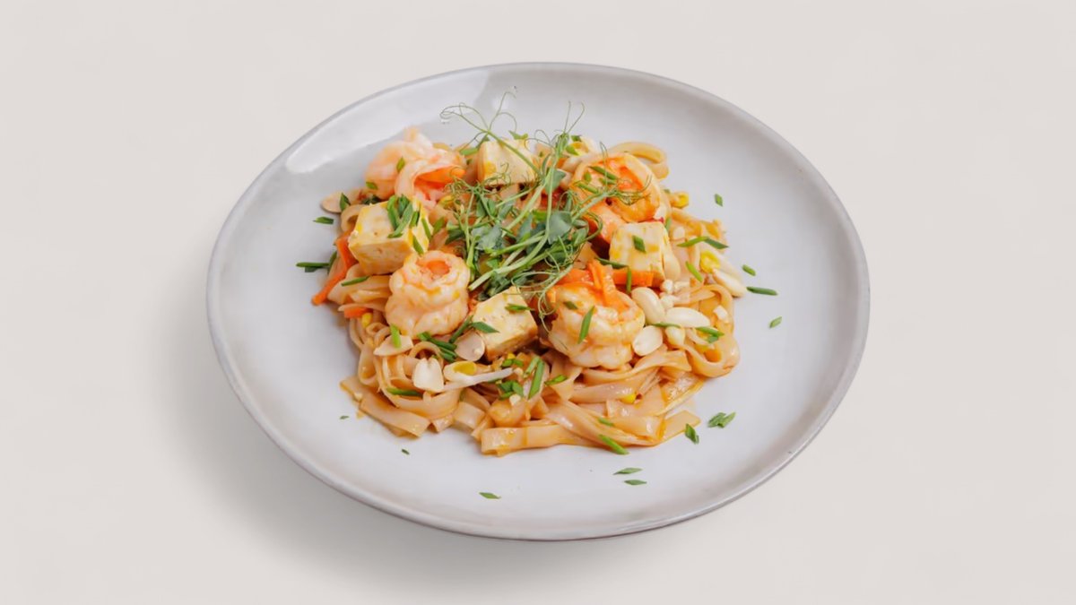 Нежные креветки и рисовая лапша в классическом соусе пад-тай