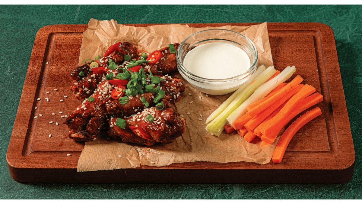 Куриные крылья, морковь, сельдерей, кунжут, чили, соус Блю чиз