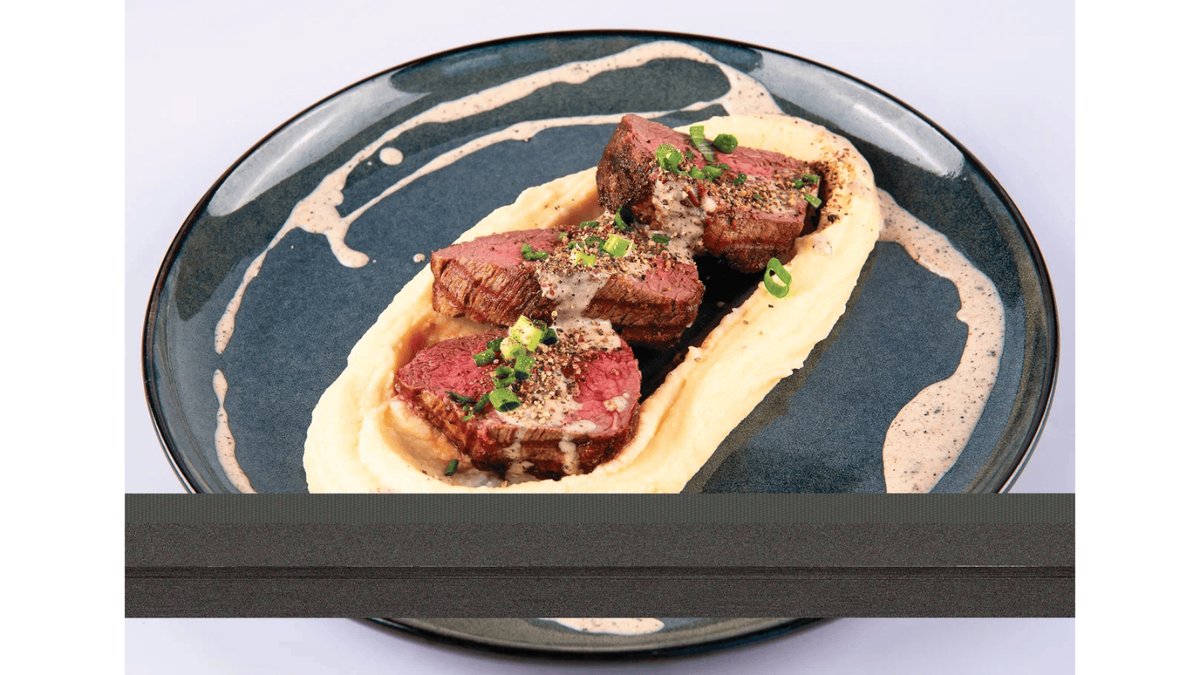 Говяжья вырезка в смеси 5 перцев, с картофельным пюре и перечным соусом