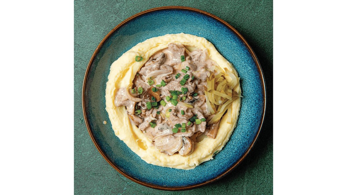 Говядина с шампиньонами в сливочном соусе. Подается с пюре