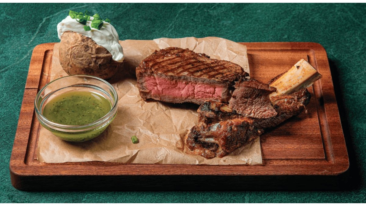 Томленое говяжье ребро под соусом BBQ, подается с кукурузой, запеченым картофелем, солеными огурцами и халапеньо