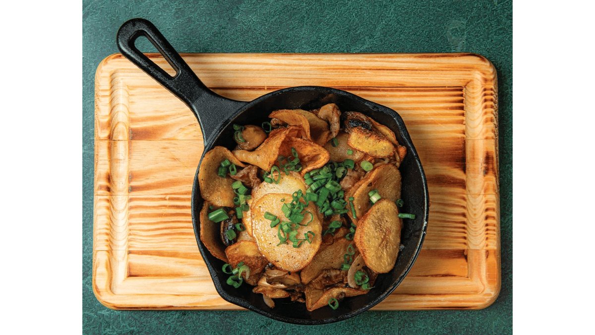 Картофель обжареный с шампиньонами, с луком и говядиной