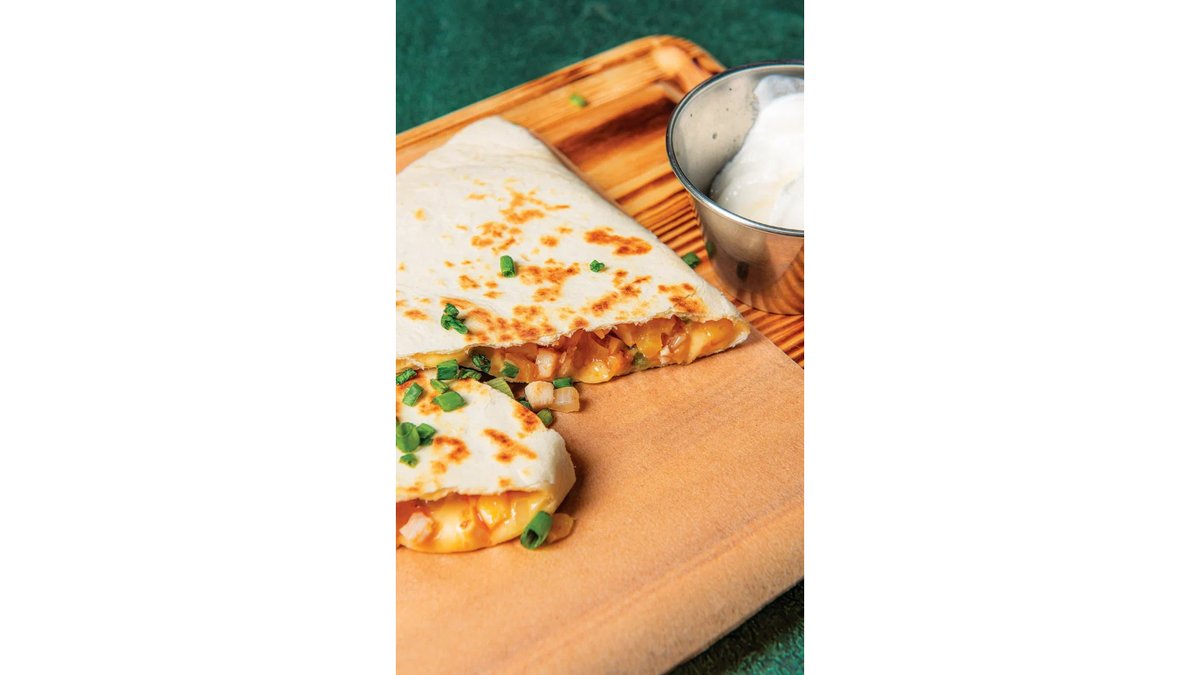 Пшеничная тортилья с куриным филе, помидоры, красный лук, сыр, кукуруза, сыр пармезан, болгарский перец. Подаеися со сметаной
