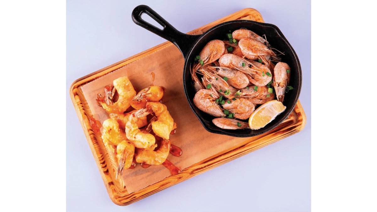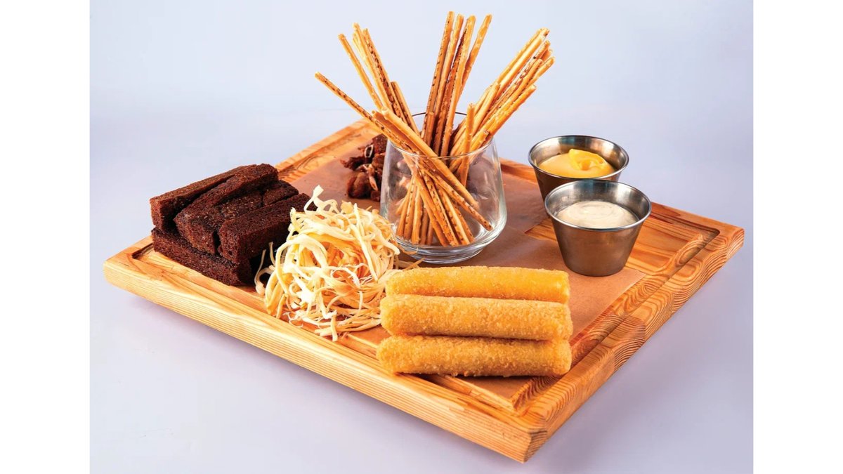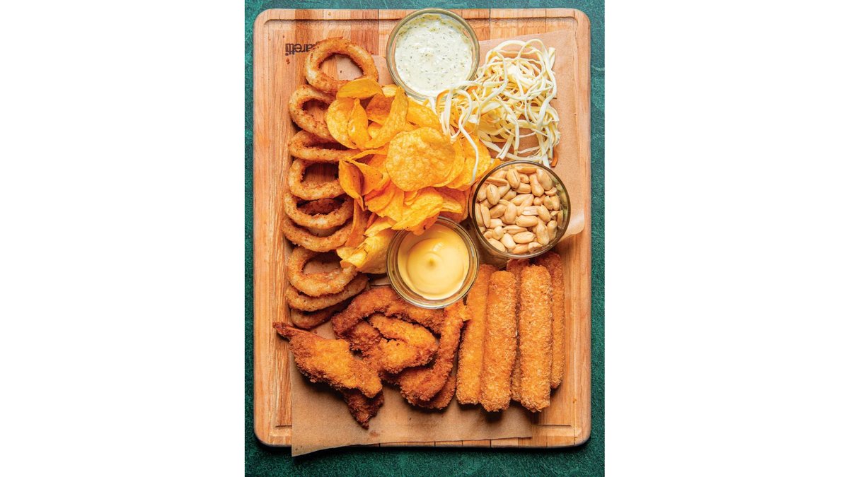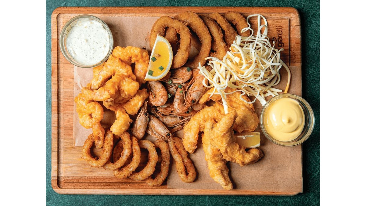 Судак в кляре, креветки пивные, креветки тигровые, сыр чечил, луковые кольца, кольца кальмара