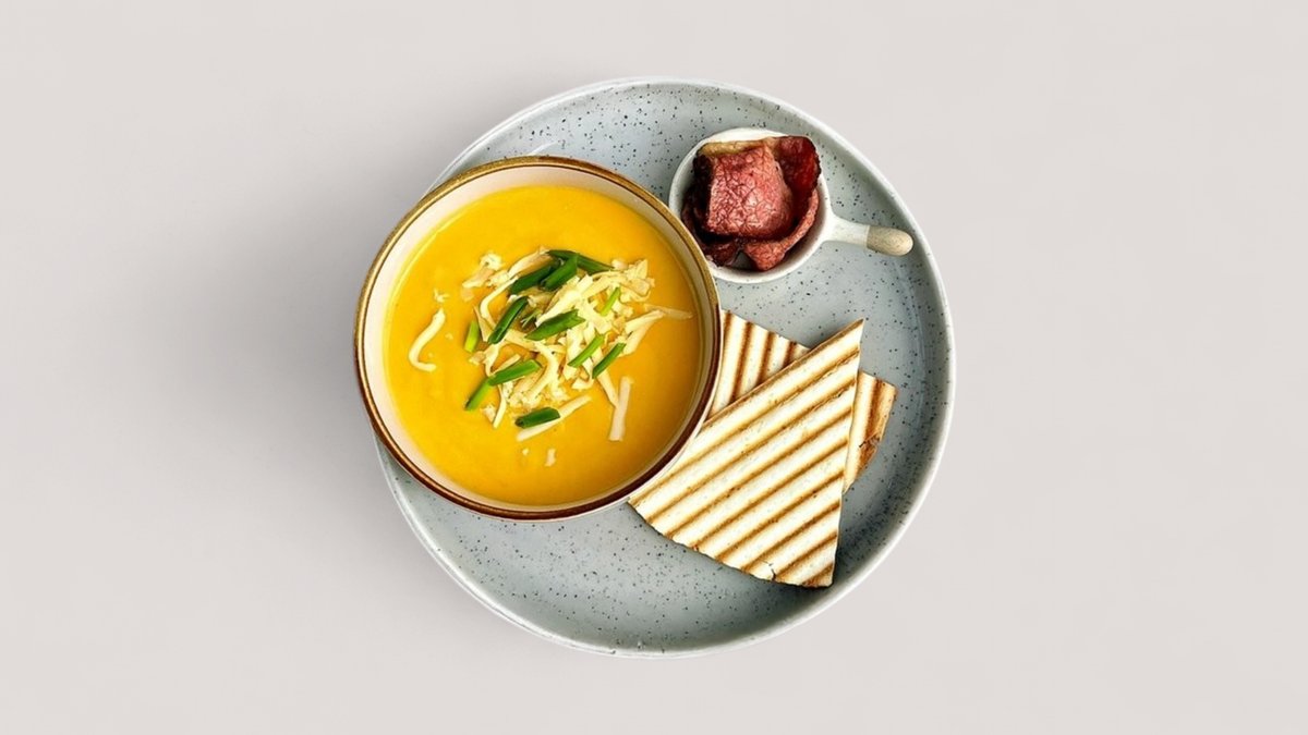Супер сырный суп из микса разных сыров, всего 389 ккал, подается с говяжьим беконом