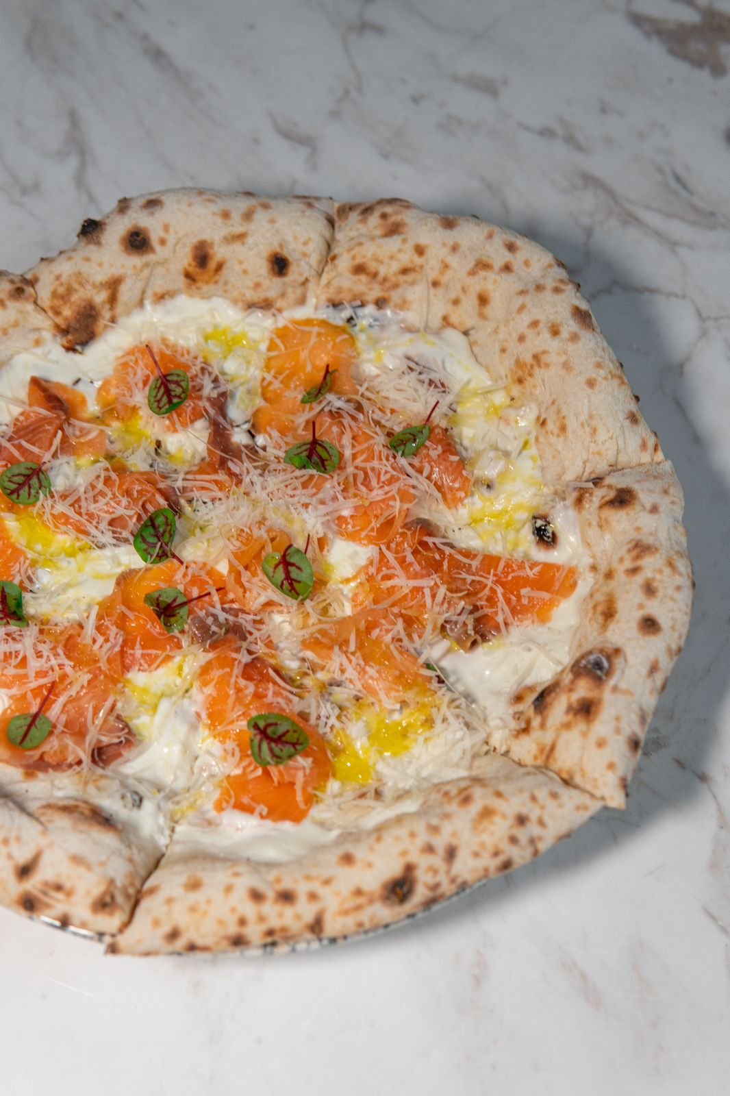 Лангустины, помело, черри, брокколи, перепелиные яйца, икра тобико, семечки подсолнуха, соус на основе домашнего майонеза.