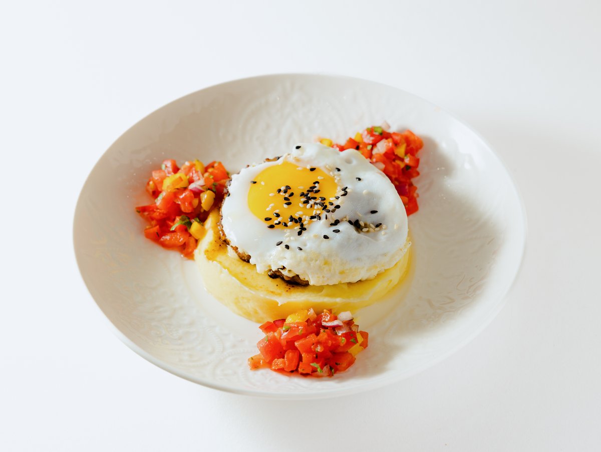 перец светофор, помидор свежий, помидоры пилатти, лук, чеснок, кинза, семена кунжута, куриные яйца, хлеб тартин