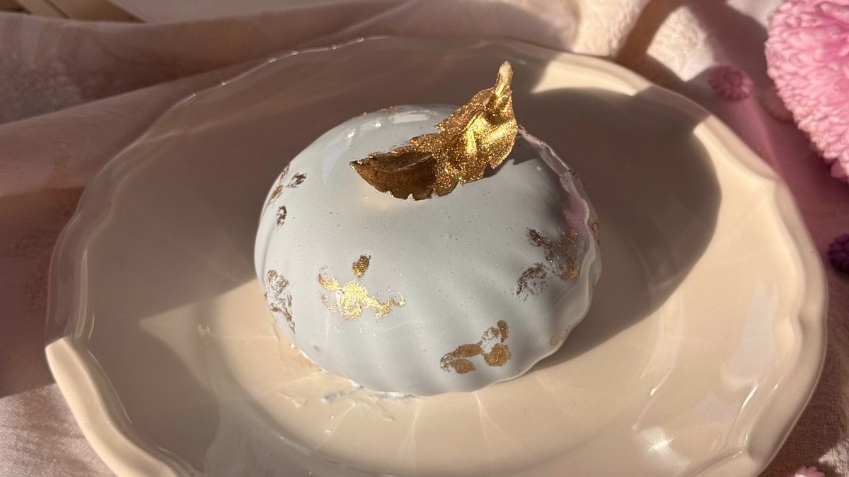 Мусс молочный улун, медовое кремю, бисквит с чаем улун, «ткань» из чая жасмин, шоколадная маска