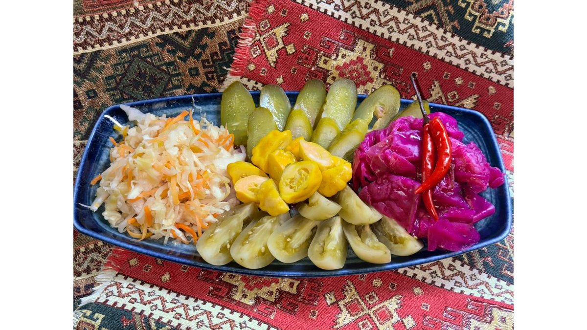 Красная капуста, помидоры зеленые, огурцы маринованные, квашенная капуста, патиссоны