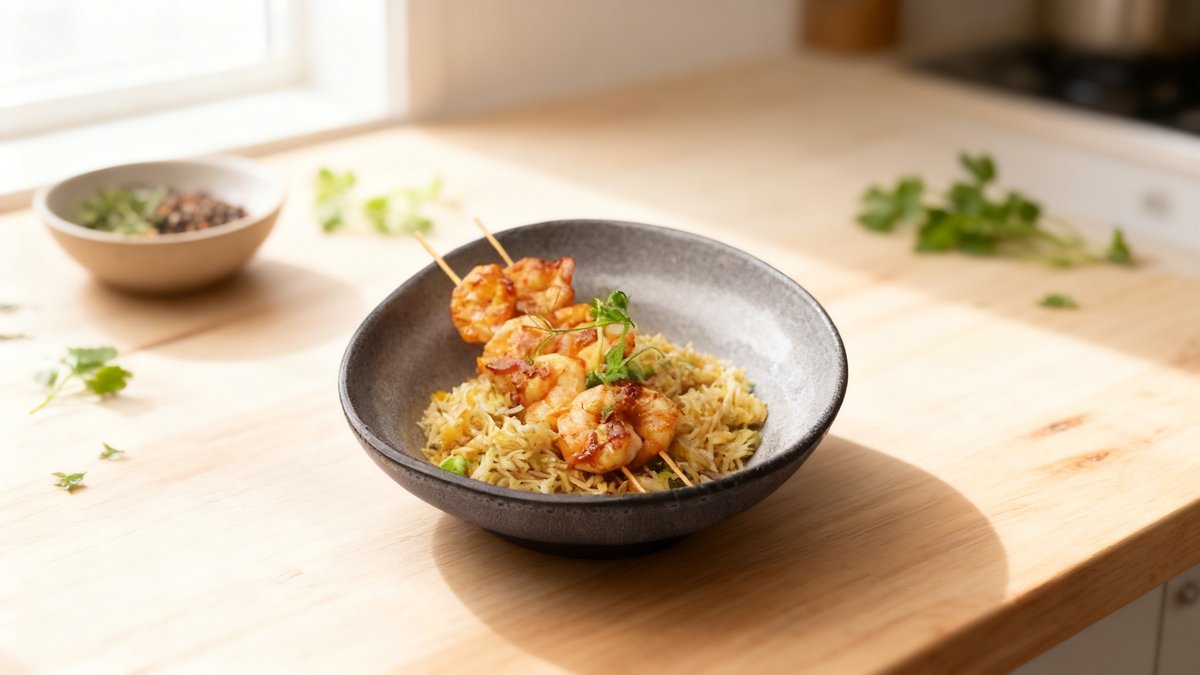 Salmon (fish fillet), shrimp, canned tomatoes, Parmesan cheese, spinach, spices (salt, pepper), teriyaki sauce, basmati rice (garnish), butter, fresh thyme