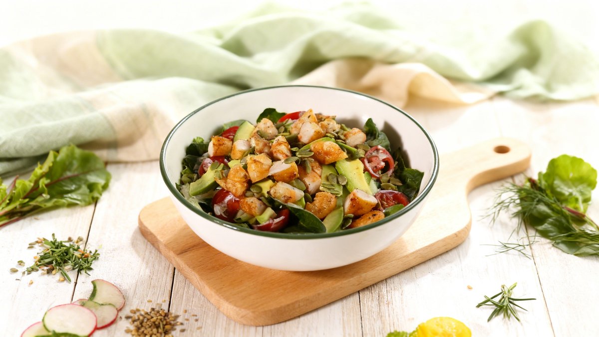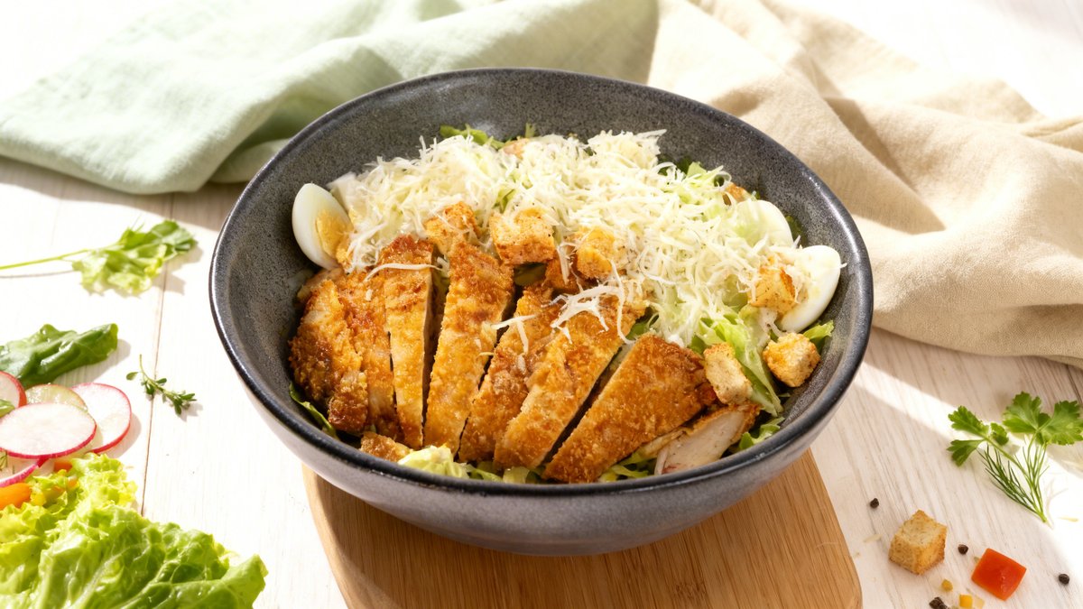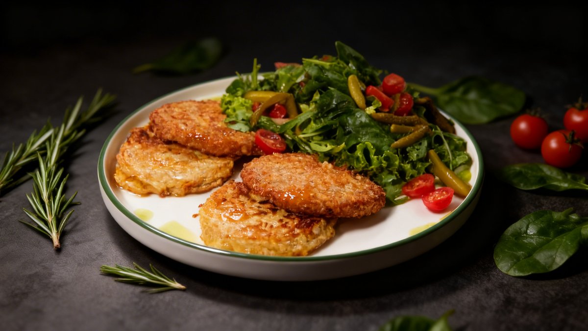 Chicken cutlet, butter, mixed salad (lettuce, lollo rosso, arugula, spinach, cherry tomatoes, parsley, red onion), potatoes, red onion