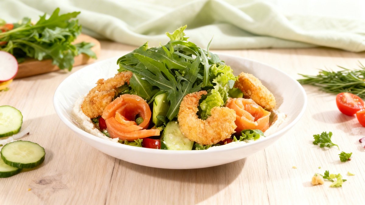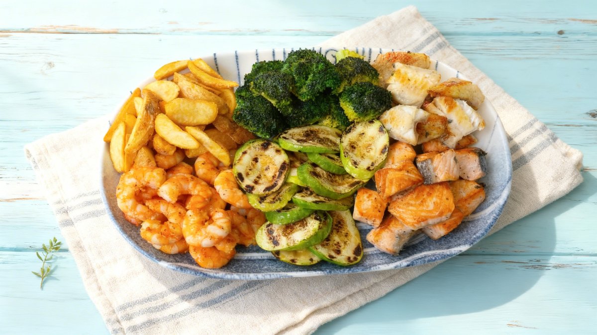 Fried shrimp, salmon (salmon fillet), perch, broccoli, potato wedges, zucchini, broccoli, dill, tartar sauce