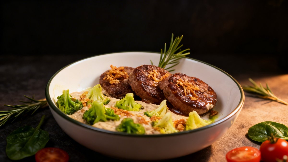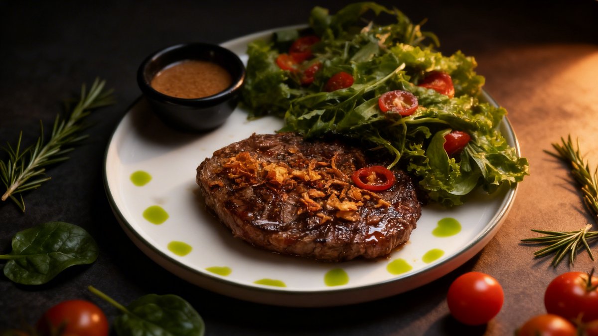 Ribeye steak, sunflower oil, potatoes, cream, demi-glace sauce, Dijon mustard, fried onions, garlic butter (garlic, sunflower oil)