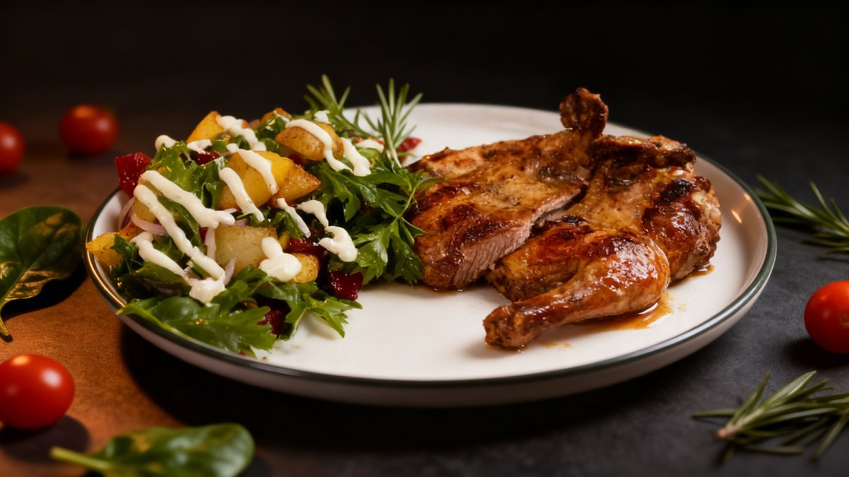 Chicken, boiled potatoes, parsley, red onion, homemade mayonnaise sauce (mayonnaise, anchovies, lemon juice, Dijon mustard), rosemary (as part of the marinade)